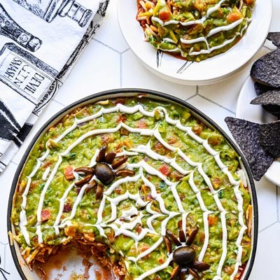 - Pipe sour cream in concentric circles atop the guacamole, then use a toothpick to spread the sour cream from the inner circle to the outer circle, creating a spider web pattern.